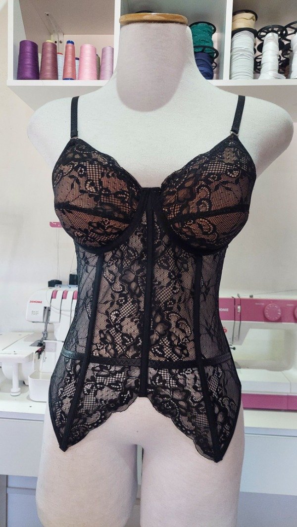Corset elaborado en puntilla, taza armada, largo hasta la cadera, ballenas en delanteros costados y espalda. con cinta raso para ajustar en espalda.
